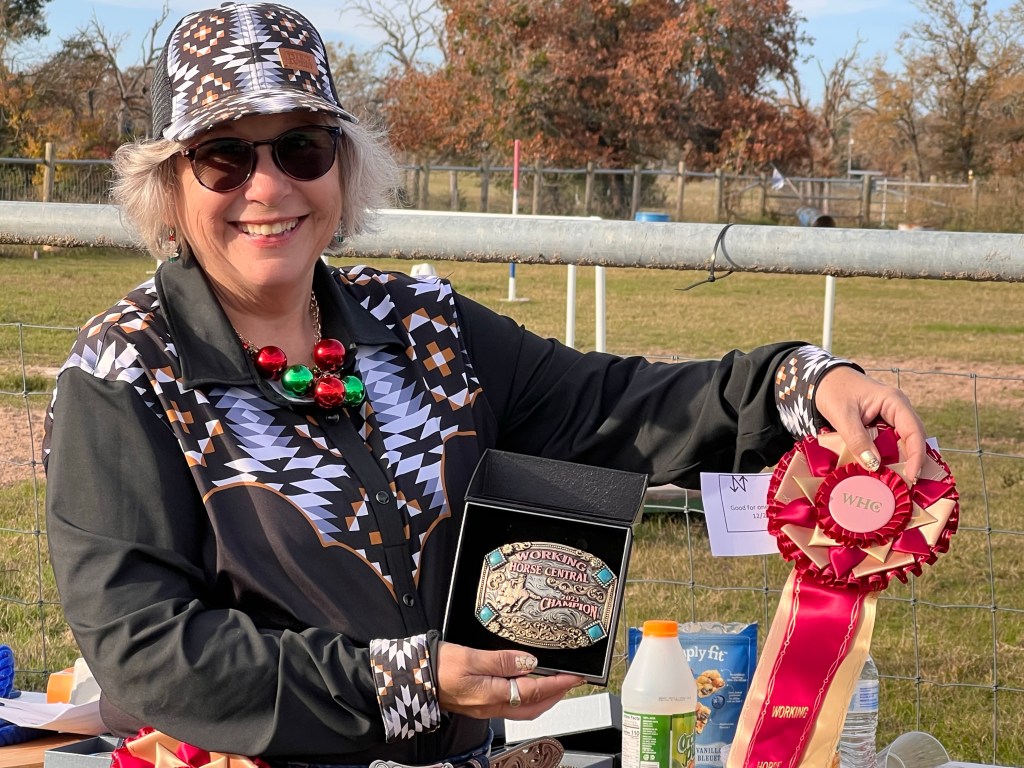 No, I’m actually not the champion, but I’m very happy with myself and the beleaguered Apache, my equine partner in the last Working Horse Central show of the year. We’d been scheduled to go camping this weekend, but with no pet care, we canceled. I’m glad, because that let me go to the show.