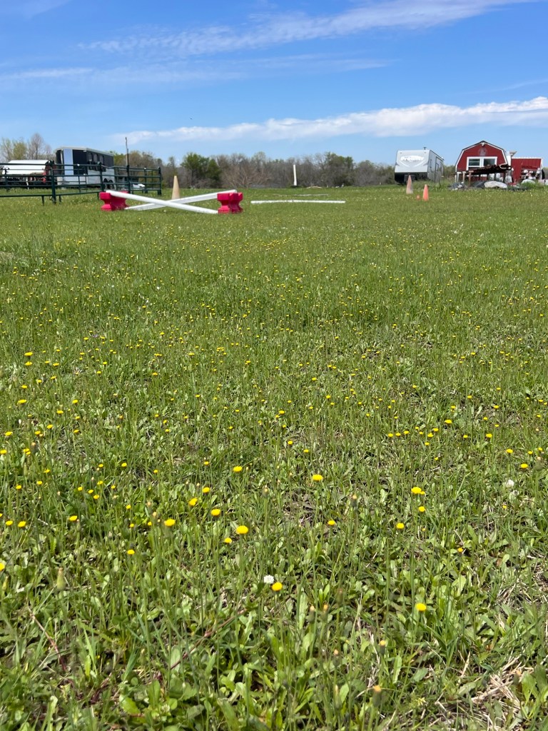 Imagine my surprise when Tarrin said we’d do all three parts of the show this afternoon. She had the dressage arena set up, too. Unfortunately, I’d barely studied the dressage test, thinking I wasn’t doing it. Oops.