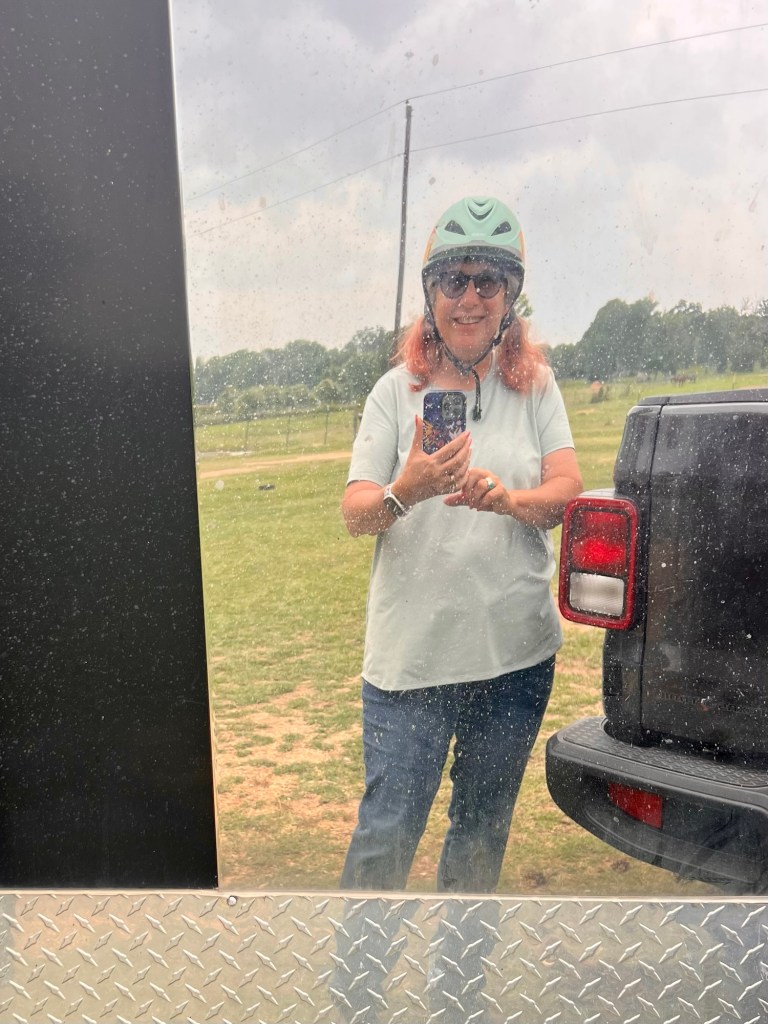 Me getting ready today, as reflected in the horse trailer.
