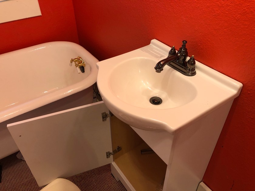 The faucet looks good, even though Tubby’s faucet is gold and clashes. Tubby has the last laugh, though, because that faucet’s hooked up and works (enabling hand washing).