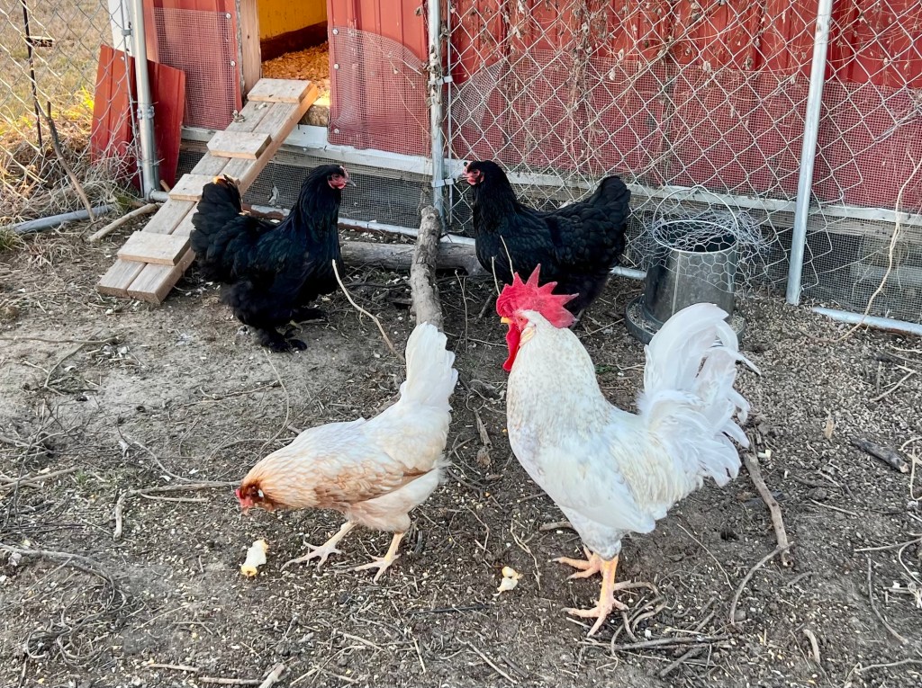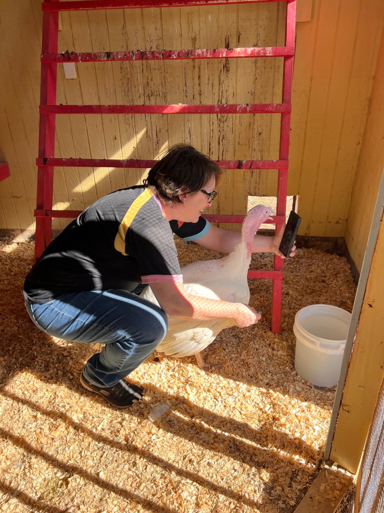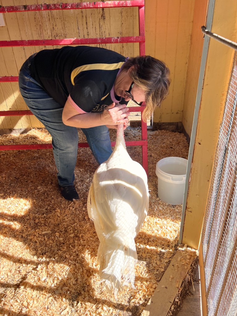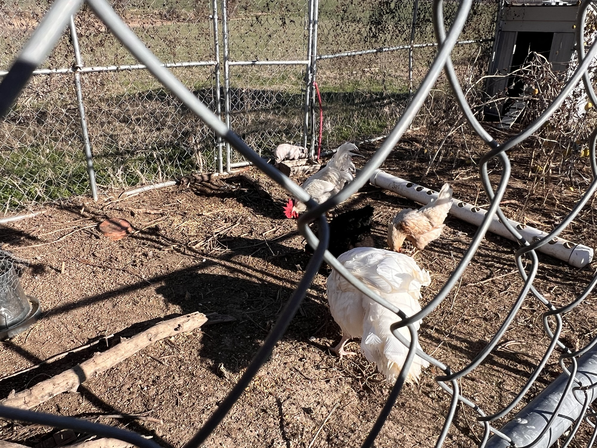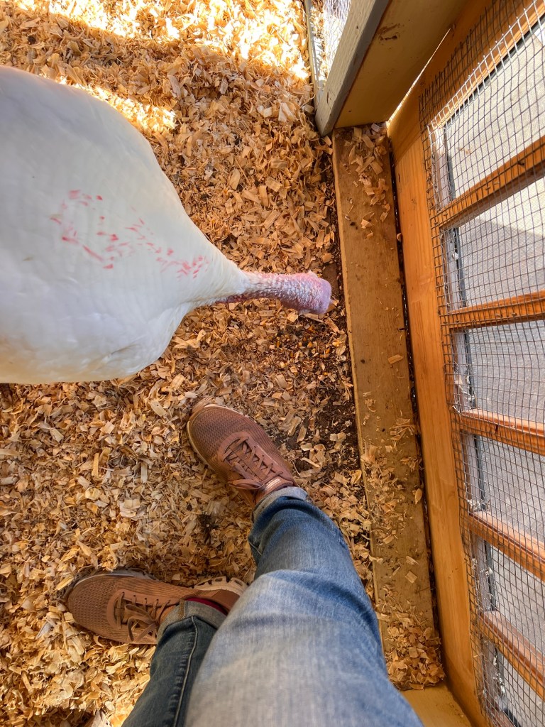 Anyway, she has a new habit. When I’m in the pen feeding them and filling the water dishes, she silently sneaks up on me. I feel a presence and turn around to see her beak, less than an inch from my leg, as she stands as closely as she can get. I think she’s figured out she gets extra love and petting when she does that. It’s a weird feeling realizing your fowl is stalking you.