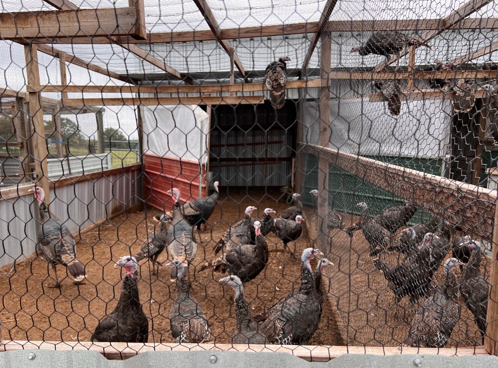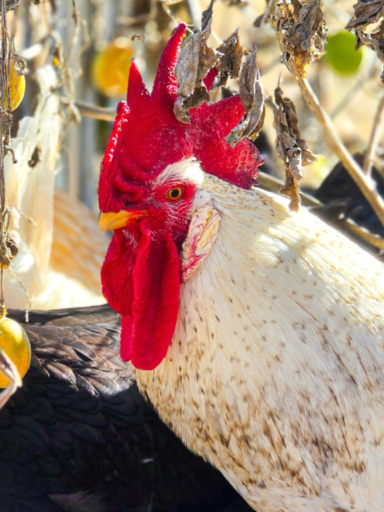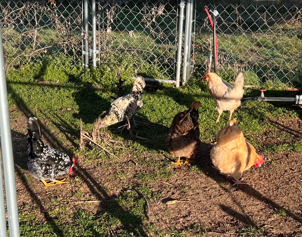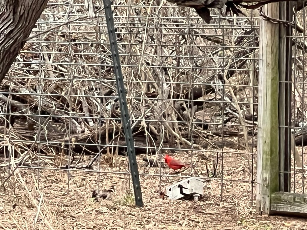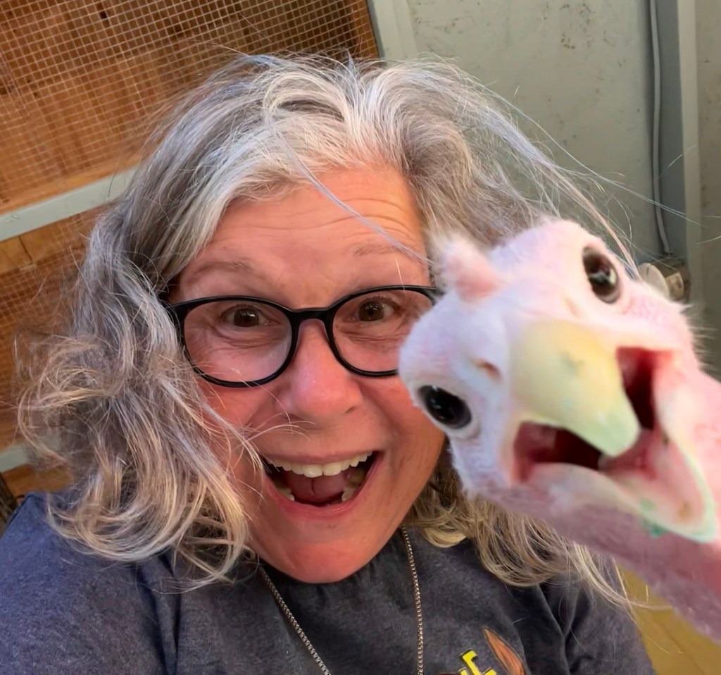 Anyway, she has a new habit. When I’m in the pen feeding them and filling the water dishes, she silently sneaks up on me. I feel a presence and turn around to see her beak, less than an inch from my leg, as she stands as closely as she can get. I think she’s figured out she gets extra love and petting when she does that. It’s a weird feeling realizing your fowl is stalking you.