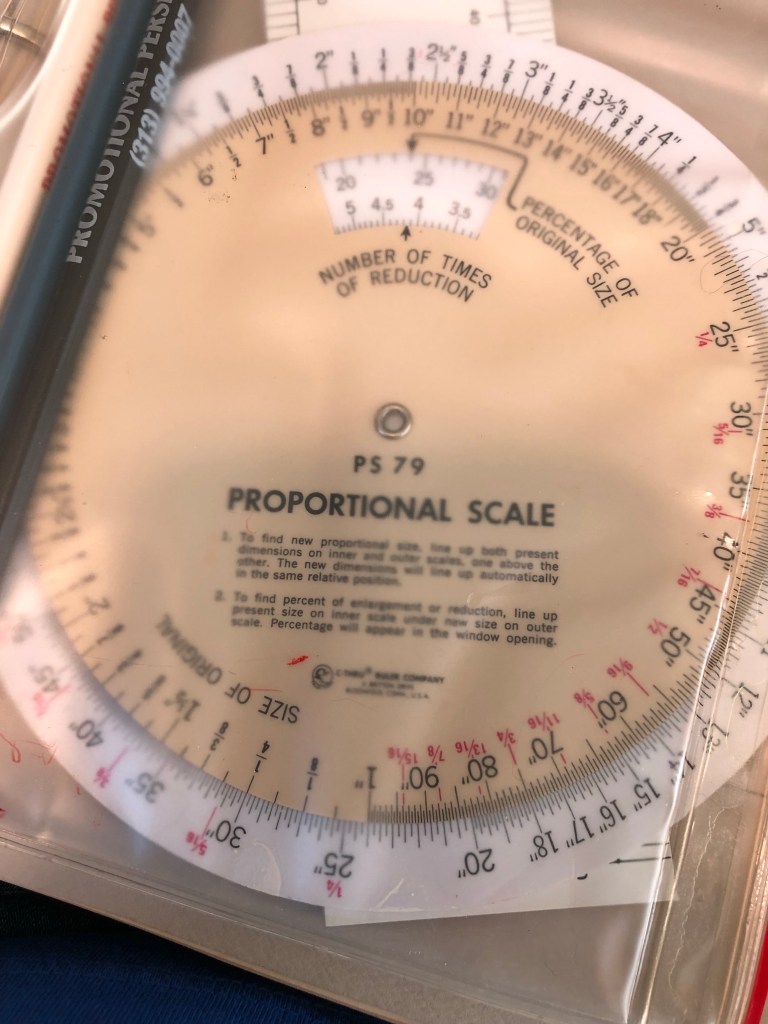 The other tool that came with the notebook was this crazy wheel that tells you how much you have to reduce your text to fit in a certain space. I imagine this was very handy. It also makes me really glad I didn’t make newsletters until personal computers were available. I never had to paste up anything. Yay.