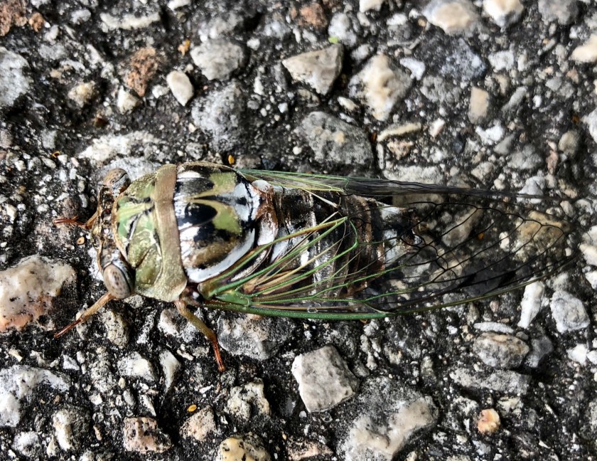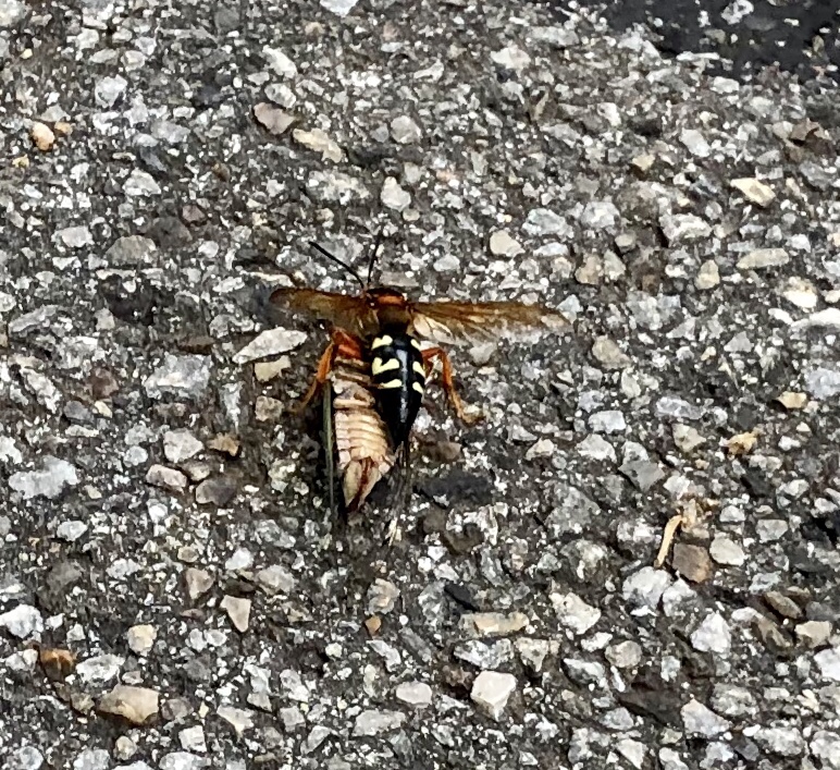 Even though it’s a big wasp, a cicada is bigger. Good thing the wasp has strong wings!