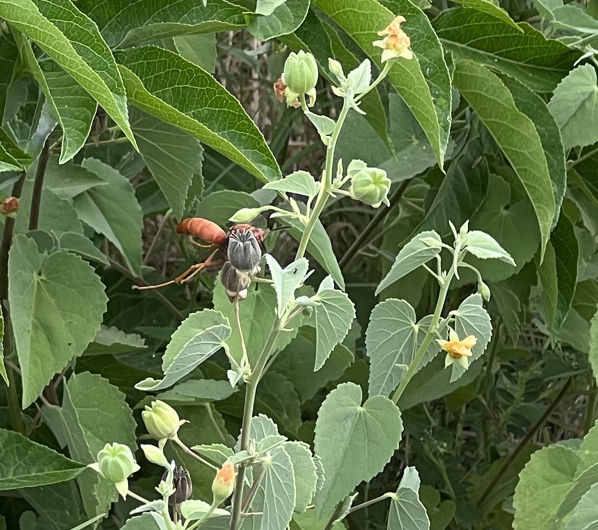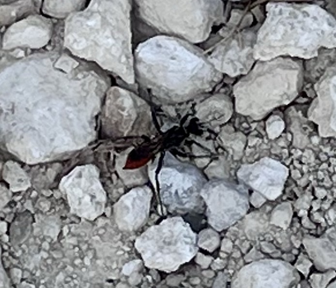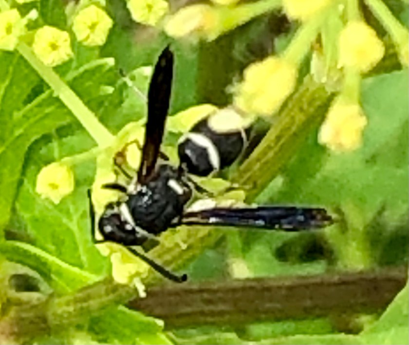 I also see lots of wasps ever day. Usually it’s mud daubers, yellow jackets, and such, but I also see very pretty orangey-red wasps, and today one I don’t see much, black with a red abdomen.
