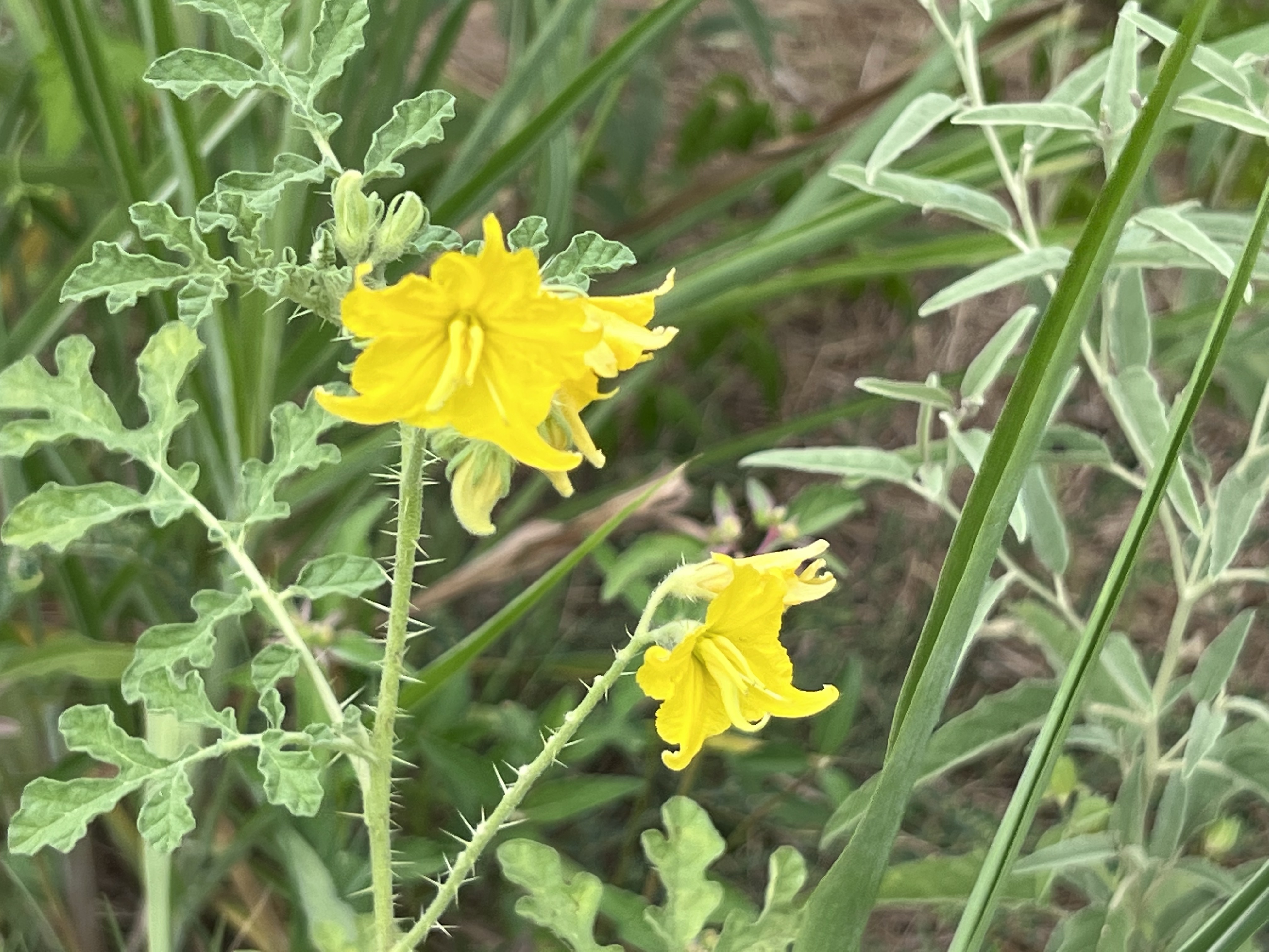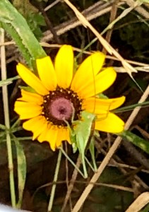 There are a very few flowers blooming, but I found a couple. There are lots of passion vines, but the flowers look funny. I guess the herbicide got to them. And there was one sad Mexican hat flower. Of course buffalo bur is blooming and one or two others that nothing can stop. Ooh and in the best plant news: I found milkweed seeds blowing around! More for the butterflies.