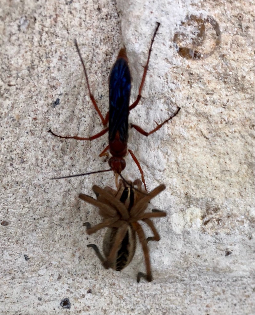 And as a postscript I have two cool insect photos to share. First, I saw a spider wasp dragging a hapless wolf spider off for dinner.