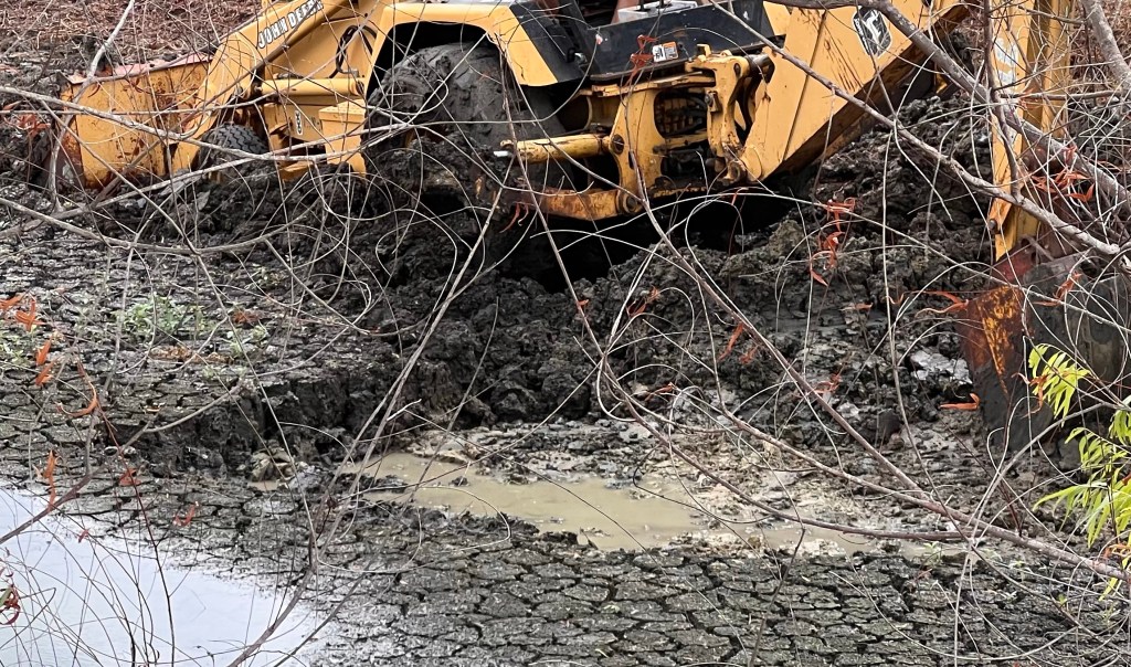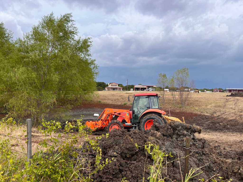 The horses were entertained this afternoon as the pond got de-silted. Both our backhoe and the regular tractor got in there. Lee had lots of fun making giant piles of rich, dark dirt, which then got to the clay layer.