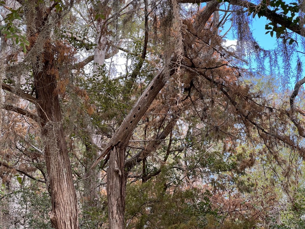 Deer!My friends the feathershanksWoods road Another big treeMossy rocks Weird flyWoodpecker home fell downMore lakeThere’s a house wren in this picture. Asters. Cool vines on treesNon native nandinaPretty wood oatsDeer tracksCanine tracks. Also saw duck footprints. Fine new damMore mossSkipperI think it’s a Phoebe Silver bluestemPecans and rec hallFormerly the largest cedar elm in TexasRoad to Bastrop Tree canopyBaby pines More fire damageCedar sage The same view as the star photo above